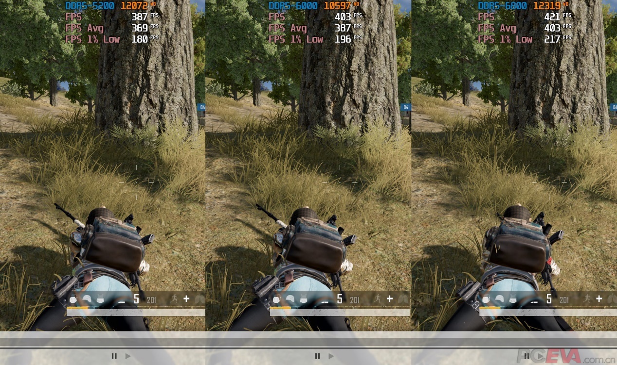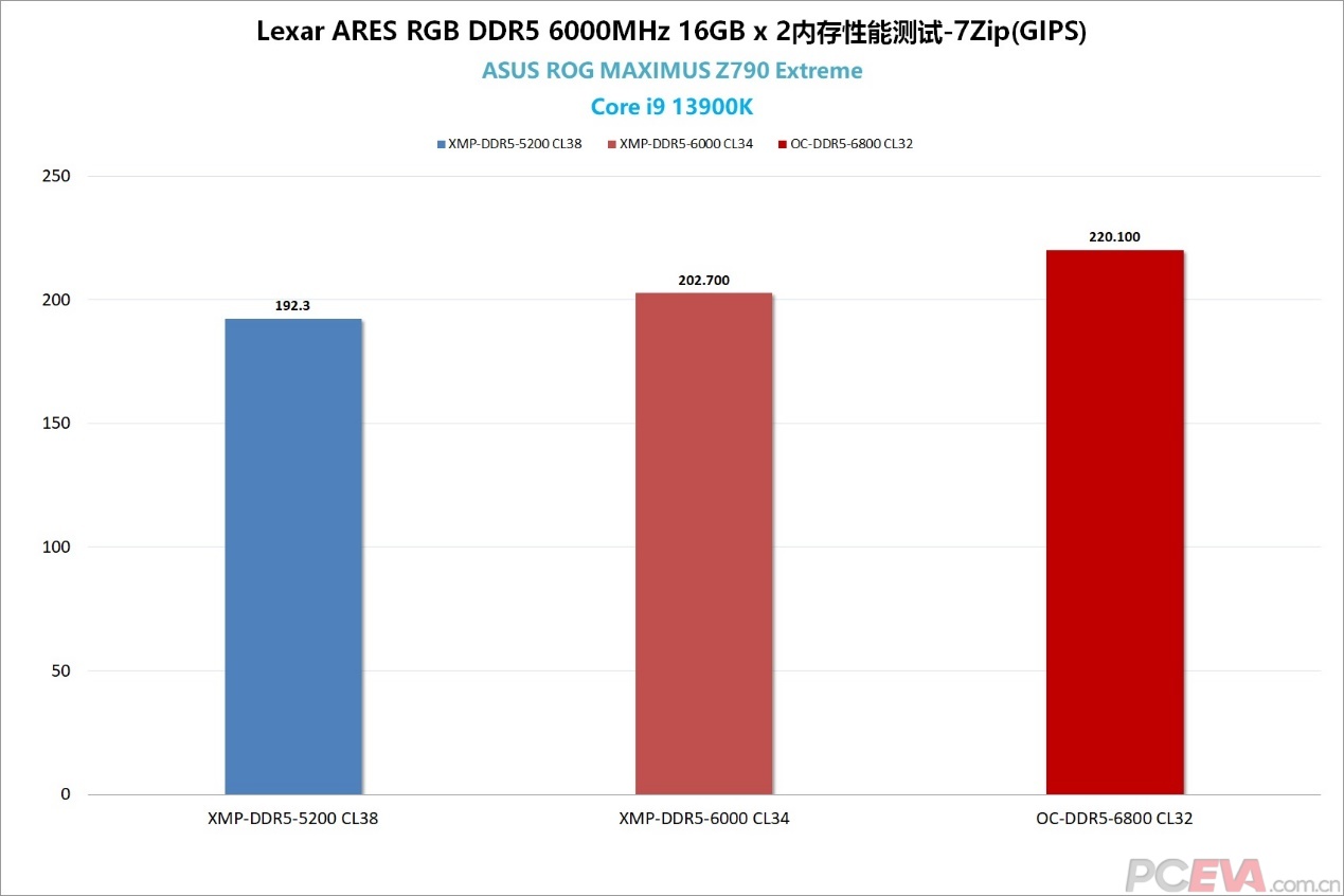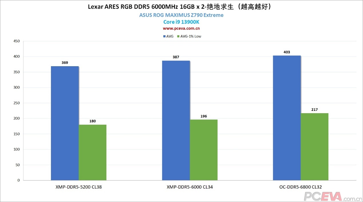 内存性能测试我们选择了DDR5-5200 CL38、DDR5 6000 CL34、DDR5 6800 CL32三组频率,其中第一组代表了比较常见的DDR5 XMP频率,第二组是雷克沙战神内存的XMP频率,第三组是雷克沙战神内存的手动超频频率。三组进行对比,可以给玩家参考一下相对常见的DDR5 XMP频率,雷克沙战神内存的高频XMP以及手动超频后,对于性能有多大收益。 雷克沙战神DDR5内存XMP频率达到DDR5-6000 CL34,在AIDA64内存读写测试中,内存读取速度达到95.7GB/s、写入速度达到83.5GB/s、复制速度达到85.8GB/s。相较DDR5-5200 CL38的XMP频率,读写速度提高了15.7%、13.5%以及14.9%。 雷克沙战神DDR5内存手动超频到DDR5-6800 CL32频率后,读写速度提高到了108.9GB/s和104.9GB/s,复制速度达到了103.9GB/s。相较默认的XMP频率,读写速度提高了13.7%、25.6%,复制速度提高了21%。 内存延迟方面,雷克沙战神DDR5内存的XMP频率延迟在68.2纳秒,相较DDR5-5200频率大约降低了12.2%。手动超频到DDR5-6800 CL32,内存延迟降低到56.7纳秒,延迟降低了16.8%。 7Zip是一项衡量内存带宽的性能测试,在一定程度上也代表了生产力性能测试。预设XMP DDR5-6000 CL34的7ZIP综合压缩/解压缩成绩达到202.775 GIPS,相较DDR5-5200频率提高了5.4%。至于手动超频到DDR5-6800 CL32频率,相较预设的XMP频率提高了8.5%,达到了220.126 GIPS。 绝地求生应该是最吃内存的电竞游戏,游戏设置采用1920 x 1080分辨率,三极致画质,使用录像回放功能测试游戏帧数表现,并用AfterBurner录制5分钟的平均帧和1% Low帧,对比三套内存频率的帧数表现。 预设XMP DDR5-6000 CL34的平均帧数和1% Low平均帧相较DDR5-5200 CL38分别提高了18帧和16帧,大约4.8%和8.8%的帧数。超频到DDR5-6800 CL32后,平均帧数和1% Low平均帧提高了16帧和21帧,大约4.1%和10.7%的帧数。在绝地求生里,提高内存帧数和收紧内存时序,1% Low平均帧提升幅较大一些,平均帧提升幅度就比较一般。 |