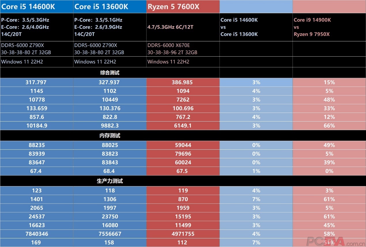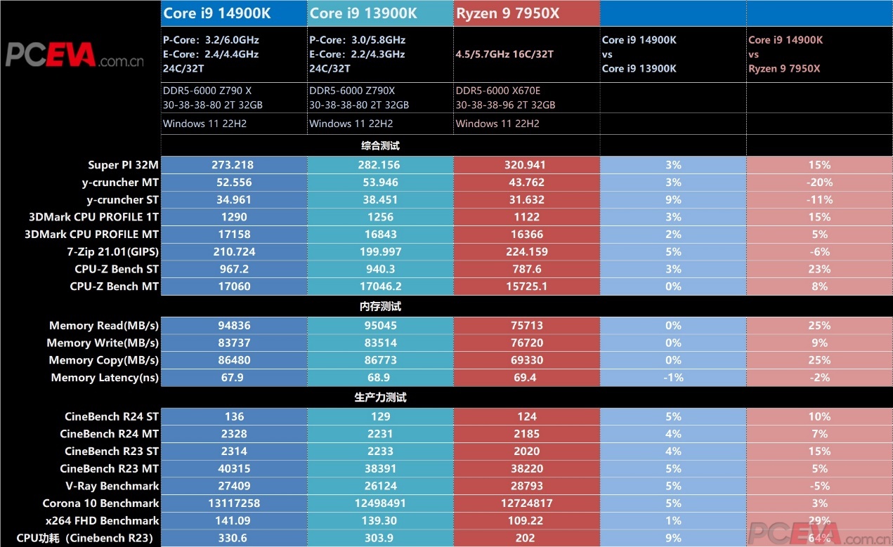![]() 我们先来看基准测试,i9-14900K相对i9-13900K大约有2%-5%的性能提升,在轻载的单核性能测试中,因为核心频率能进入6GHz的最大睿频状态,所以性能提升幅度可以到9%左右。生产力部分的基准测试也差不多,i9-14900K的成绩比i9-13900K高4%-5%左右,只有X264的转码测试,仅有1%的提升。功耗部分,i9-14900K的功耗大约比i9-13900K高9%左右。 和对手锐龙9 7950X对比,i9-14900K的单核性能更有优势,能领先锐龙9 7950X大约10%-20%;多核性能则能领先锐龙9 7950X大约3%-7%,只有V-Ray测试略输7950X 5%。内存读写速度也是i9-14900K更强,读取速度比7950X高25%,写入速度比7950X高9%,内存延迟也要低2%左右。至于功耗部分,就是锐龙9 7950X更低一些了,解锁PL2的i9-14900K功耗能达到330W左右,如果按照英特尔的默认设定,它的功耗表现和散热表现会好一些。 接下来我们看i5-14600K的测试情况。 ![]() 酷睿i5-14600K的单核性能和多核性能提升幅度都比较平均,大概在3%-4%左右,只有Cinebench R24异军突起,成绩比酷睿i5-13600K提高了7%左右,推测是高负载下14600K的核心频率更稳定,所以成绩更高;功耗方面,i5-14600K大概比i5-13600K高7%左右。 酷睿i5-14600K和锐龙5 7600X对比,因为有14个核心加持且本身架构单核性能更强,所以基准测试成绩是全方位的击败锐龙5 7600X,具体来说多核性能大概比锐龙5 7600X强30%-60%,单核性能强大概5%-10%。内存读写性能也是i5-14600K更强,而且因为锐龙5 7600X是单CCD结构设计,读取速度减半,被14600K拉开了49%的幅度,内存延迟倒是基本差不多。功耗方面,酷睿i5-14600K比锐龙5 7600X高大约51%,大概在160W左右。 |