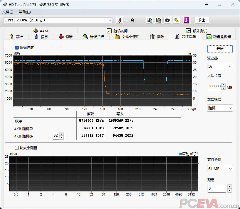 建立分区并格式化,向盘内填充512GB不可压缩数据,空闲等待后进行HDTune文件基准测试,此时SK海力士P41 2TB可提供大约150GB的SLC写入缓存空间,依然能够保障日常使用所需的突发大量写入。
