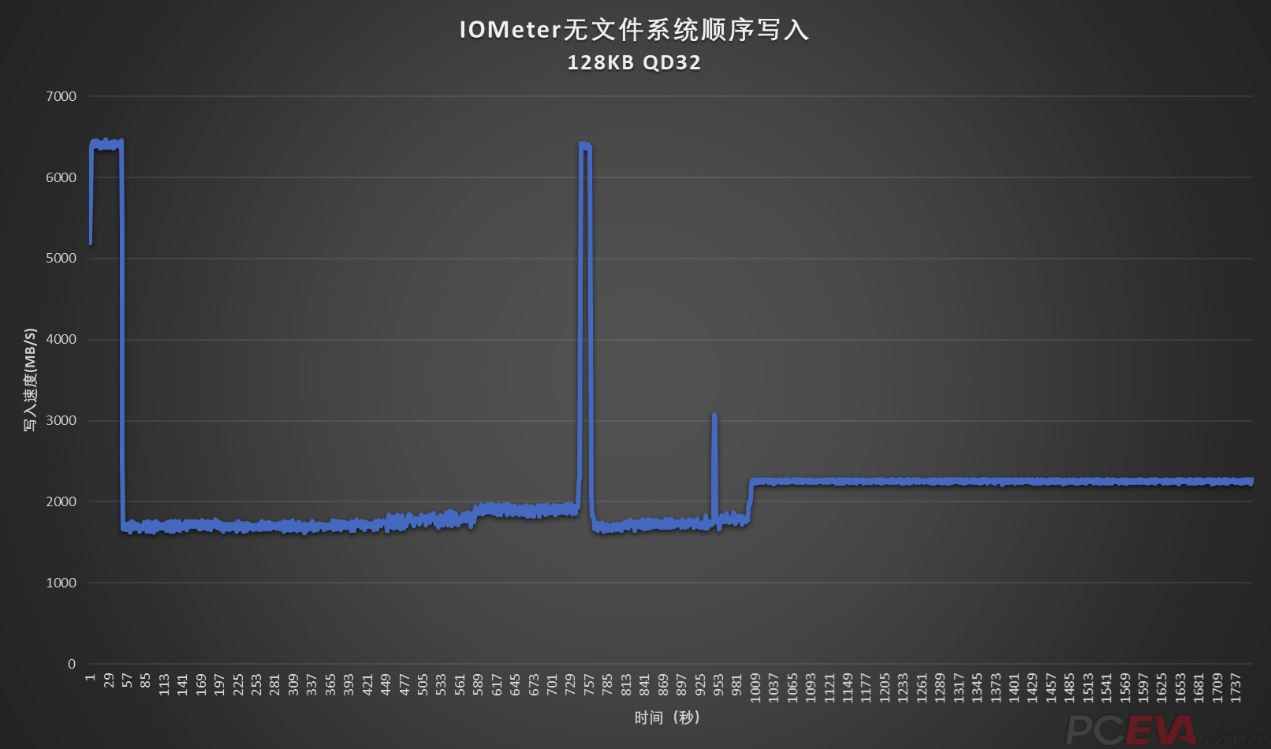 顺序写入测试在无文件系统条件下使用IOMeter进行128KB QD32写入,每秒记录后整理如下图所示。SK海力士P41 2TB在空盘情况下的SLC缓存容量约为300GB,闪存直写阶段的速度约为2259MB/s,高于三星990 PRO 4TB的1989MB/s。