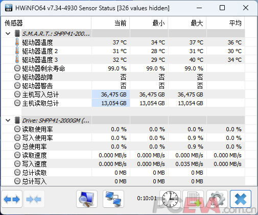 这个测试在机械革命无界14笔记本内进行,SK海力士P41 2TB作为系统盘使用。通过HWiNFO64可以看到SK海力士P41具有3个不同的温度读数,除了默认温度数据之外,温度3可能与主控温度关联。
