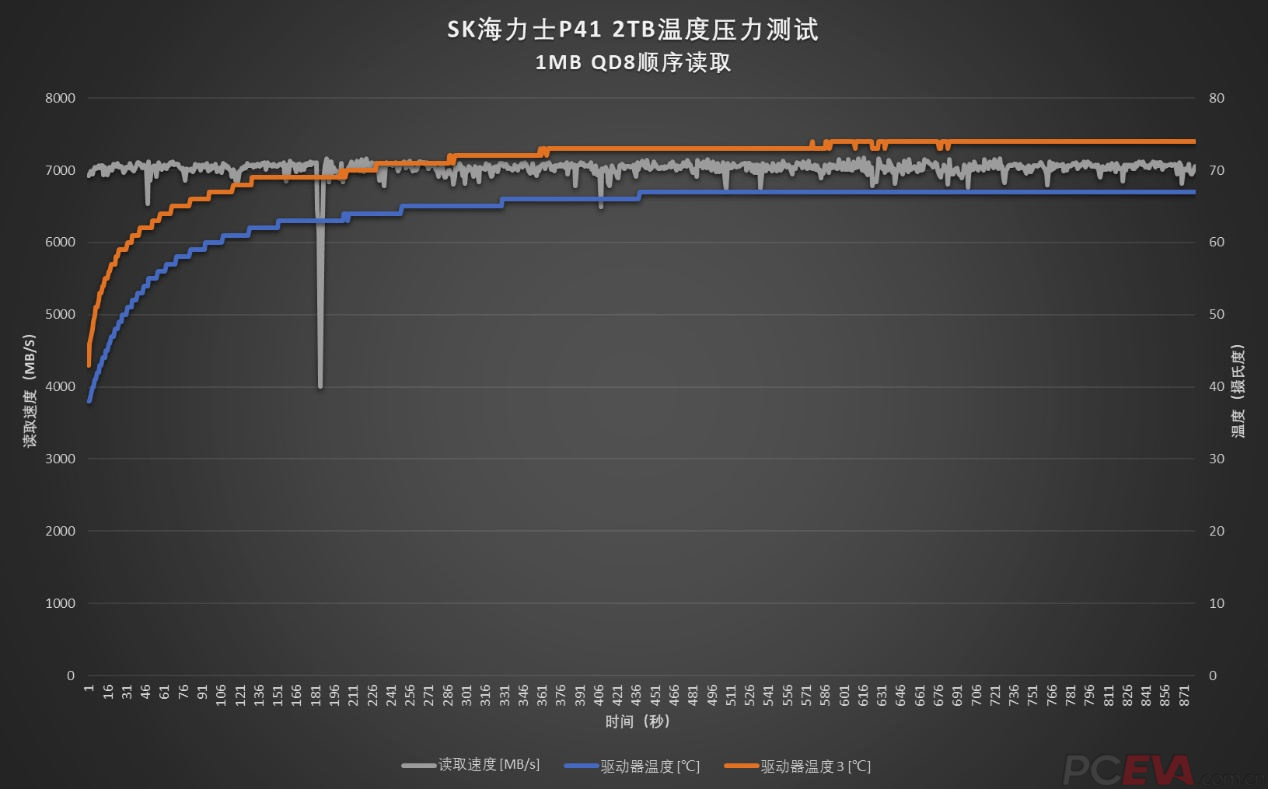 在连续15分钟满载读取测试中,SK海力士P41的温度始终保持在安全范围以内,未发生过热限速事件。下图中的一次速度下滑和P41本身作为系统盘使用,后台进程读写硬盘造成的干扰所致。