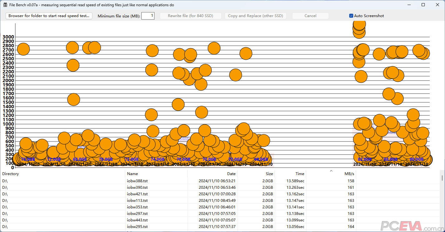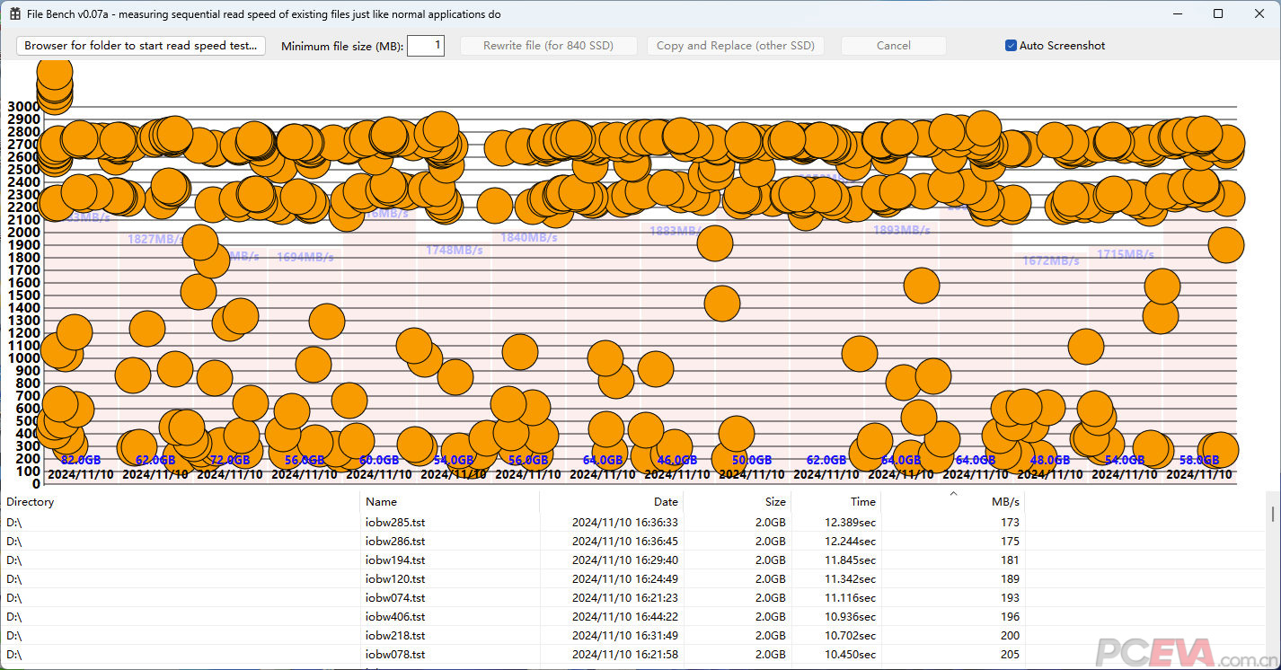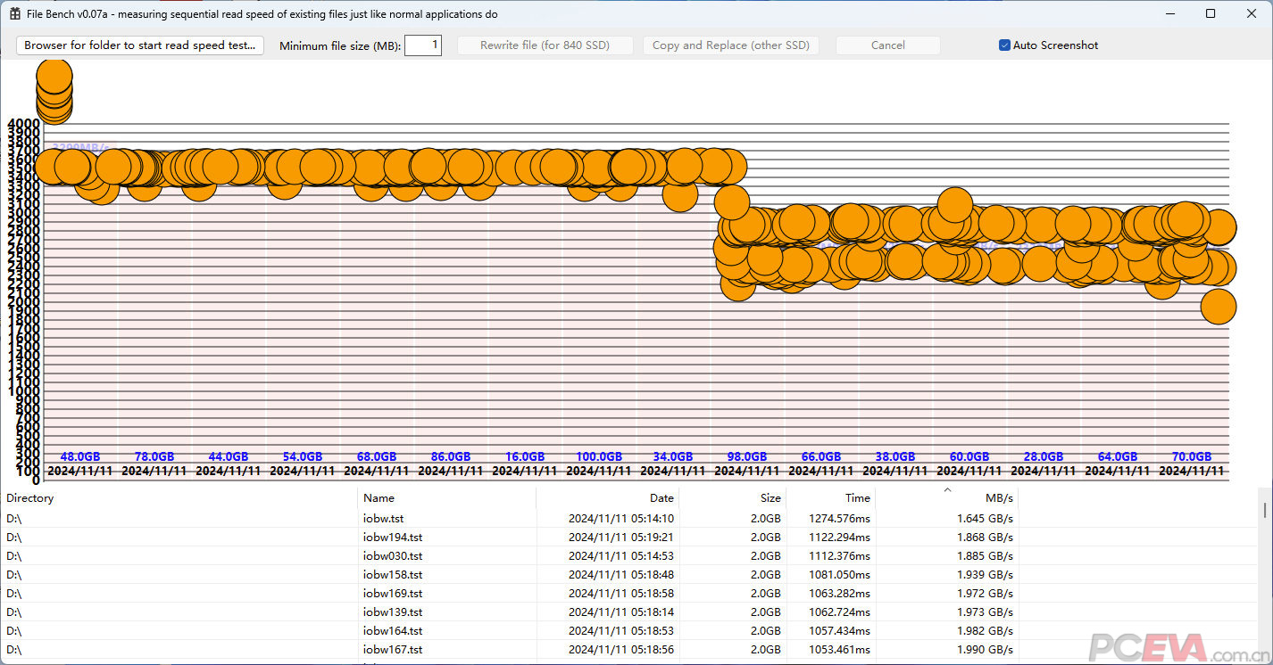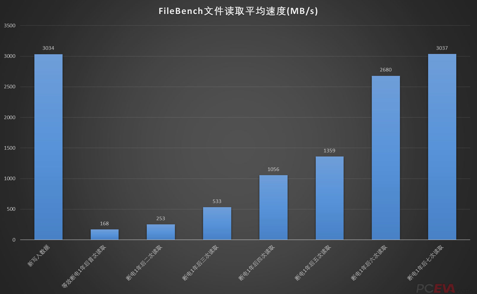 早在TLC SSD时期人们就发现,一些内容长期未发生变化的“旧文件”的读取速度会随着时间流逝而逐步衰减。常规的测速软件只能测试刚刚写入数据的读取性能,所以读取掉速问题较为隐蔽,但却会对日常使用体验产生实实在在的负面影响。在做数据保持测试时,我们顺便进行了读取掉速测试。高温烘烤前新写入数据的读取测试结果如下,平均读取速度3034MB/s。(由于读取区块大小的差异,此处读取速度和CrystalDiskMark测出的顺序读取速度不同) 在主机写入量超过标称值33%的情况下,等效1年时间的旧文件读取掉速确实很明显:平均读取速度下降到168MB/s。好消息是虽然读取速度慢,但测试过程中没有出现卡住不动的情况。 通电闲置4个小时后,进行第二次读取测速,速度已经出现明显回升,平均读取速度253MB/s。说明SSD已经在通过数据搬移重写等方式恢复“旧文件”读取性能。 此后我们又每次间隔数小时重复进行一次读取测速,可以看到读取性能恢复势头良好: 到烘烤后第七次读取测速时,盘内文件的读取性能已经基本恢复到烘烤前的水平: 这个测试说明长江存储PC41Q有能力发现并处理发生读取掉速的“旧文件”。 正常使用中通常不会遇到这种闪存磨损程度很高而又连续一年不开机的情况,PC41Q无需像测试中这样反复读取和等待,而是可以从源头上避免读取掉速问题的发生。 在完成以上测试后,这块长江存储PC41Q的最终SMART健康信息如下。目前SSD依然处于可用状态,无任何故障。 |