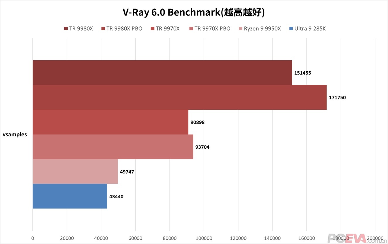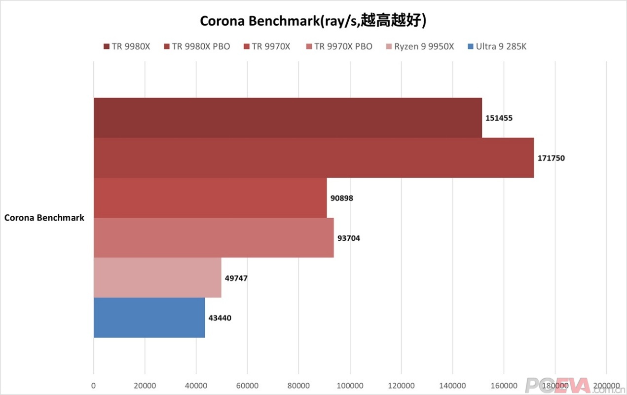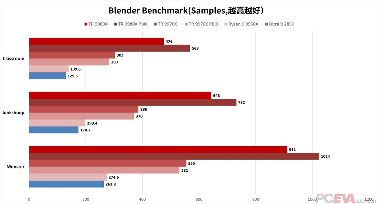 ![]() V-Ray渲染器是由Chaos Group与ASGVIS公司联合开发的专业渲染软件,主要应用于建筑可视化、影视动画等领域的3D场景渲染,对于超高线程数支持更好。 ![]() 从测试结果看,TR 9980X的测试成绩大约是R9 9950X的3倍,开了PBO更是能达到3.5倍。和U9 285K对比,TR 99 80X的成绩大约是其3.5倍,开了PBO后能达到3.9倍。另外,TR 9980X开了PBO后,获得了13%的性能提升,可见V-Ray对于128线程的并行优化度确实不错。TR 9970X的成绩大约是R9 9950X和Ultra 9 285K的两倍,与R9 9950X对比的话,基本实现核心规模的等比例性能提升。 ![]() Corona渲染器同样也是建筑可视化领域的主流渲染器,可在3Dsmax、C4D等软件中使用,也是少数的坚持CPU渲染路线的渲染器。 ![]() 在Corona Benchmark里,TR 9980X的成绩大约是R9 9950X的2.7倍,开了PBO后大约是3倍的成绩。和U9 285K对比,TR 9980X的成绩大约是它的2.9倍,开了PBO后能达到3.2倍。TR 9970X的成绩大约是R9 9950X和U9 285K的1.9倍和2.1倍。虽不如V-Ray,但TR 9000在Corona渲染器里的提升也是非常大的。 ![]() Blender是一款免费开源三维图形图像软件,提供从建模、动画、材质、渲染、到音频处理、视频剪辑等一系列动画短片制作解决方案,在全世界范围都有大量动画工作室和艺术家使用它渲染动画。 ![]() 测试用的还是Blender的Benchmark三件套,TR 9980X的成绩大约是R9 9950X的3.3倍,开了PBO甚至达到了3.9倍,接近4倍的提升充分证明了TR 9980X 64核128线程的狂暴性能。TR 9980X的成绩同样是U9 285K的3.6倍,开PBO后能达到4.1倍。TR 9970X的成绩也是不俗,能达到R9 9950X的2倍,达到U9 285K的2.1倍。Blender是我们目前测下来对超高线程数优化最好的,TR 9980X/9970X的成绩基本达到核心规模等比例甚至超比例的性能提升。 |
