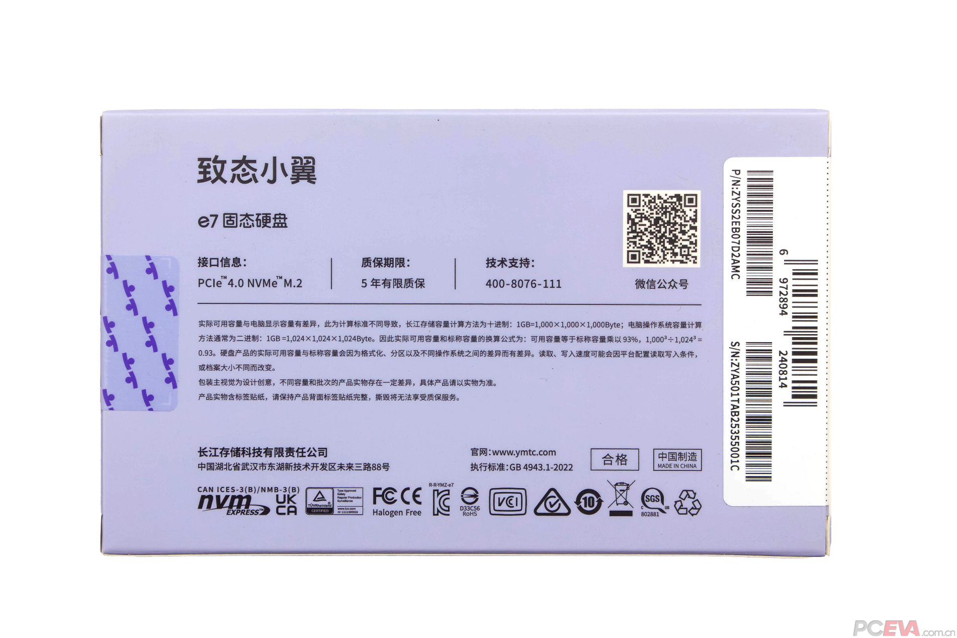 致态小翼首批推出致态小翼e7(PCIe 4.0 NVMe)和致态小翼S001(SATA 6Gps)两款型号,本次我们评测的是致态小翼e7 1TB版本。