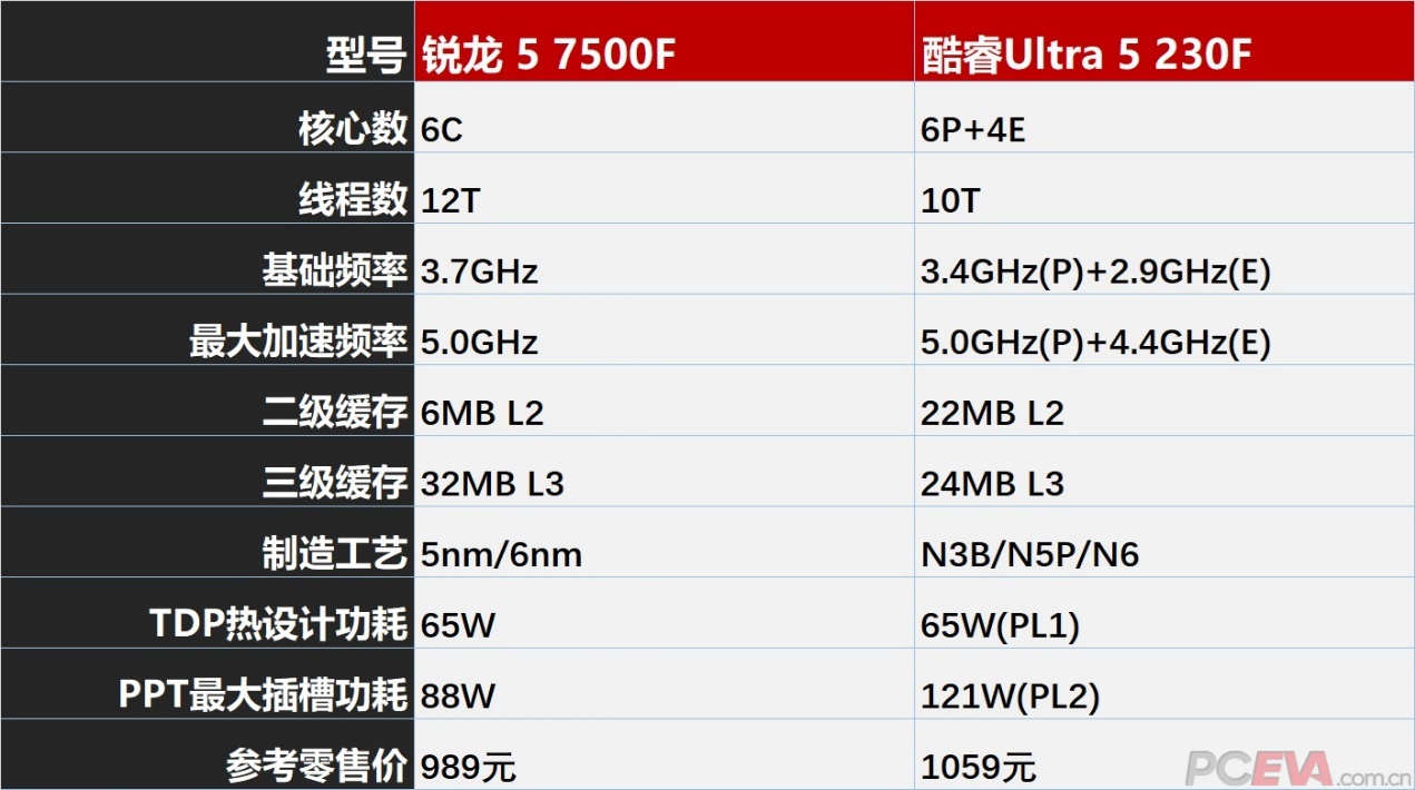 ![]() 先来看两颗处理器的规格,锐龙5 7500F有6核12线程,酷睿Ultra 5 230F有6大核4小核10线程,虽然230F的核心数更多但只有数量没有质量,其中有4个是小核,单看大核锐龙5 7500F和Ultra 5 230F一样都是6个核心,并且锐龙5 7500F还拥有更高的12线程,对游戏帧数更有帮助。其他规格如缓存和功耗,也是老生常谈的部分,锐龙5 7500F三缓更大,Ultra 5 230F二缓更大,功耗则是7500F更低,只有88W。价格部分,锐龙5 7500F盒装大约989元,酷睿Ultra 5 230F盒装大约1059元,两颗处理器都在千元左右,定位非常接近。 ![]() 处理器:Ryzen 5 7500F 主板:GIGABYTE B650E AORUS ELITE X AX ICE 内存:Kingstone FURY DDR5-6000 CL30 32GB 显卡:GIGABYTE RTX 5080 MASTER 硬盘:ZHITAI TIPlus 7100 2TB 散热器:VALKYRIE B360W 电源:ANTEC HCG X1000 锐龙5 7500F的测试平台我们搭配了一张B650E冰雕主板,这张主板是23年的主板,AM5的主板至少能用到2027年,所以现在还是我们的主力测试主板。当然,AM5平台还有更省钱的套装,比如A620或者二线品牌的B650主板,能将板U套装压缩在1200元这个价位区间,就看你能不能接受丐一些的板子。显卡和内存分别搭配了一张RTX 5080和DDR5 6000 CL30的16GB x 2内存。 ![]() 处理器:Core Ultra 5 230F 主板:GIGABYTE B860M AORUS ELITE WIFI6E ICE 内存:Kingstone FURY DDR5-6000 CL30 32GB 显卡:GIGABYTE RTX 5080 MASTER 硬盘:Kingston KC3000 2TB 散热器:ROG RYUJIN 3 360 电源:NZXT C1200 GOLD Ultra5 230F这边配的是一张B860冰雕主板,是今年刚上的新主板,定位与AMD平台类似,价格也差不多。不过,英特尔平台大概率明年要换接口,无法兼容下一代处理器,平台寿命要比AMD的短很多。显卡和内存同样是搭配了RTX 5080和DDR5 6000 CL30的16GB x 2内存。 |