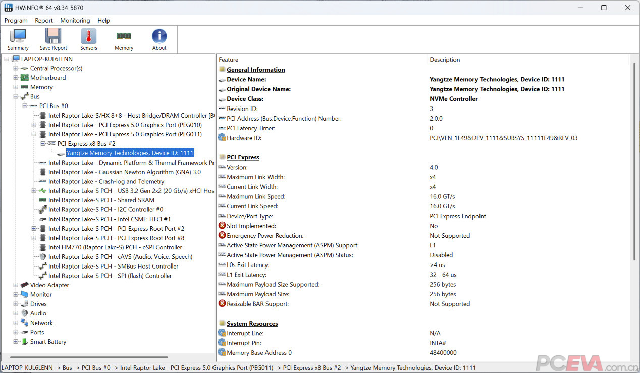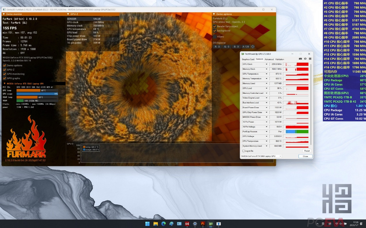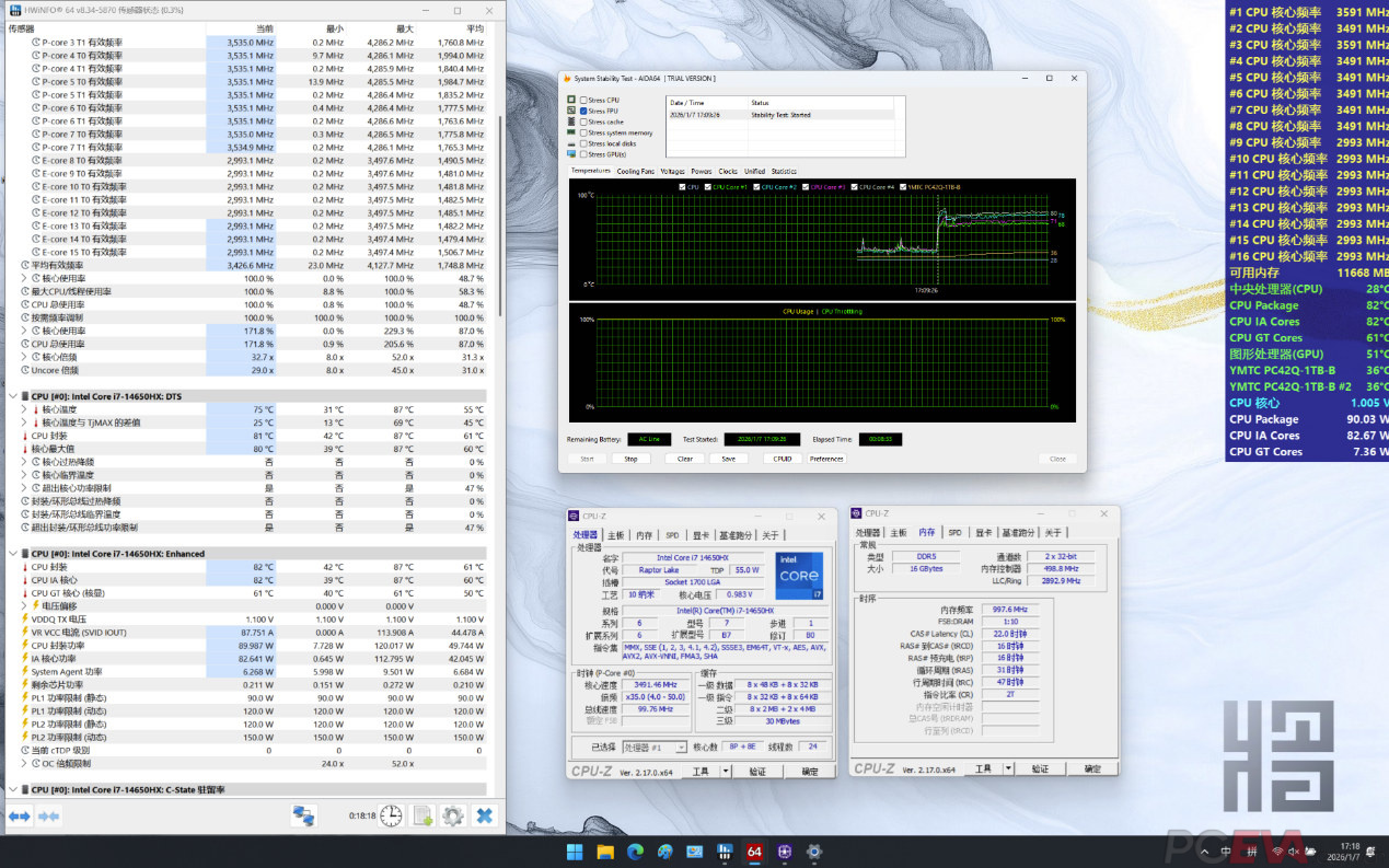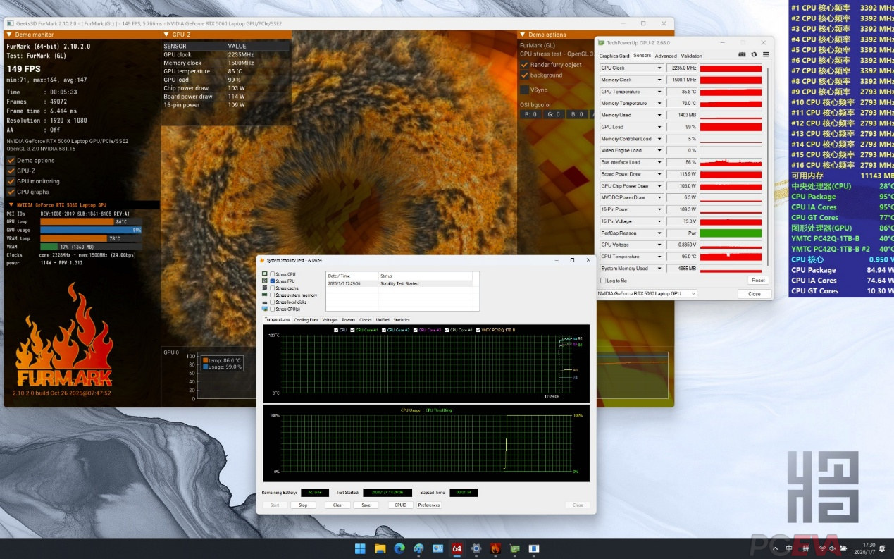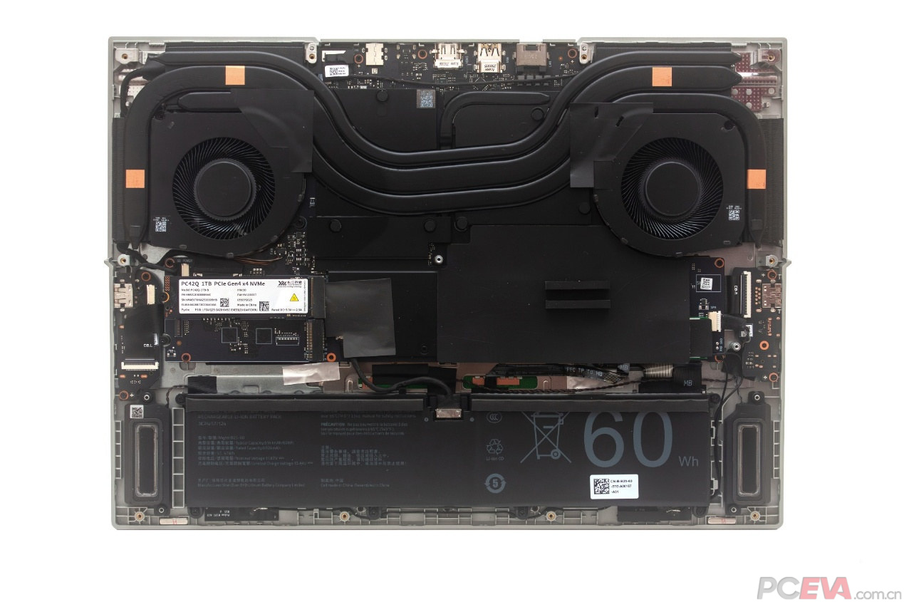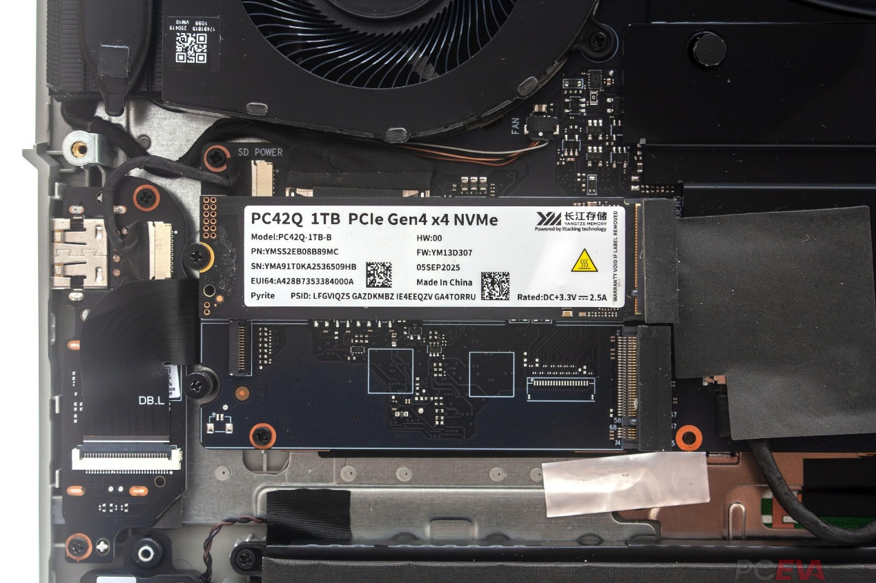 七彩虹寒戟散热架构使用双涡轮风扇6热管和四出风口设计,并使用相变导热材料降低热阻,提升散热效能,整机实现200W功耗释放。 散热表现使用AIDA64 FPU进行CPU单烤测试,室温24度,酷睿i7-14650HX拥有至高120W性能释放,性能核频率大约3950MHz。 处理器静态功率限制90瓦,性能核频率大约3535MHz,封装温度仅有82度。 FURMARK单烤RTX 5060 Laptop,功耗释放大约115瓦,核心频率2.3GHz,核心温度68度。 双烤测试使用AIDA64 FPU和FURMARK对i7-14650HX和RTX 5060 Laptop同时进行负载测试,RTX 5060 Laptop的功耗释放大约在115W,核心频率大约在2.3GHz左右,核心温度在86度左右;i7-14650HX功耗释放大约在85W左右,性能核频率3.4GHz,能效核2.8GHz,核心温度在95度左右。双烤总功耗释放大约在200W左右。 七彩虹将星X16 Pro预装了一颗长江存储PC42Q 1TB固态硬盘,另有一个M.2 2280插槽可供扩展之用。 根据HWiNFO64检测结果,长江存储PC42Q使用的是来自CPU直连通道的M.2插槽,相比PCH转接通道具备更低的存取延迟,能够更好地发挥SSD的性能。 和很多其他游戏本一样,塑料材质的D壳对SSD散热构成了一定的限制。七彩虹的做法是在D壳上设计了一块铝箔,通过导热贴连接SSD,从而扩大散热面积,提升SSD在重负载使用条件下的散热效能。尽管散热条件有限,但长江存储PC42Q本身是一款能效比非常出色的商用消费级SSD,即便是重负载使用也不易出现过热限速的情形。 |