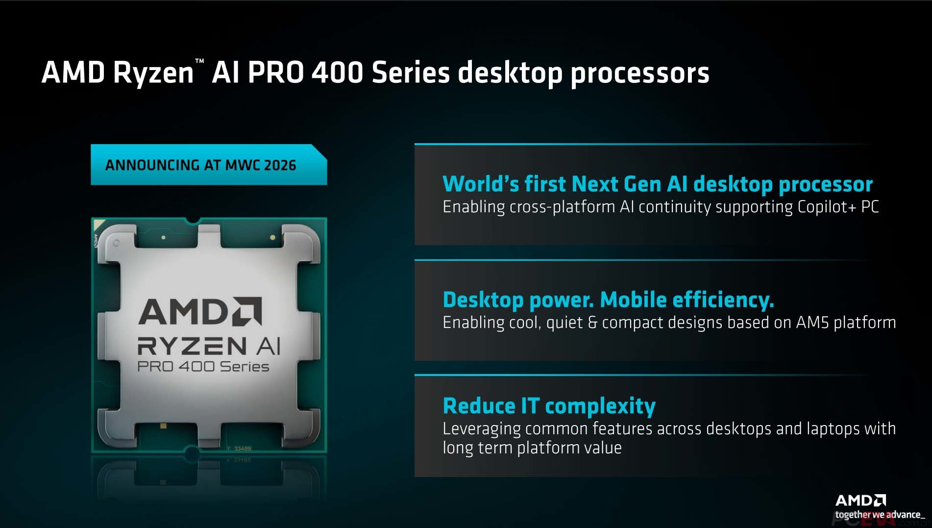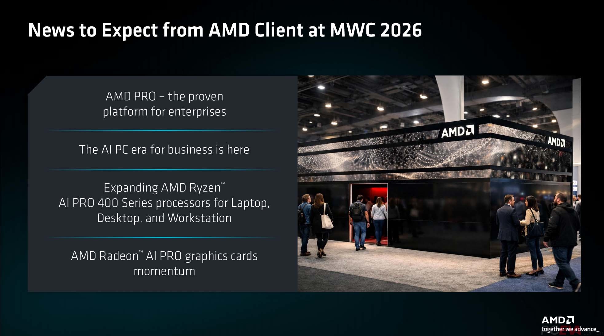 ![]() 春节刚过,MWC 2026便在巴塞罗那正式召开。在MWC 2026上,AMD 正式发布了新一代商用客户端解决方案,围绕 AMD PRO 企业级平台、Ryzen AI PRO 400 系列处理器以及 Radeon AI PRO 专业显卡,构建覆盖笔记本、台式机和工作站的完整商用 AI PC 产品矩阵,全面推进本地 AI 在企业市场的规模化落地。 AMD PRO平台 ![]() 随着生成式 AI、智能助理和本地模型推理逐步进入企业工作流,PC 的角色正从传统生产力工具,转变为承载 AI 能力的“终端计算平台”。AMD 在 MWC 2026 上明确提出,企业级 AI PC 的核心不只是单一芯片性能,而是安全、可管理性、稳定性和长期支持的系统平台。 ![]() AMD PRO 平台为企业提供从芯片、固件到系统层的整体解决方案。该平台面向企业在安全合规、设备管理和生命周期管理方面的需求进行了针对性优化,支持多层级安全机制,并可无缝融入现有 IT 管理体系,降低企业部署与运维成本。 锐龙AI PRO 400系列处理器 ![]() AMD在年初的CES 2026上为我们带来了锐龙AI 400系列处理器,而本次发布的自然是针对商用平台的锐龙AI PRO 400系列处理器,它是AMD面向商用市场推出的新一代 AI PC 处理器产品线,覆盖商用笔记本、商用台式机与移动工作站等多种形态。 ![]() 在架构层面,锐龙AI PRO 400搭载新一代 Zen 5 CPU 架构,集成 RDNA 3.5 图形架构与AMD XDNA 2 NPU。其中,NPU 本地 AI 算力最高可达 60 TOPS,可满足新一代 Copilot+ PC 及多种本地 AI 的应用需求。 ![]() 从产品规格来看,锐龙AI PRO 400主要包括Ryzen AI 9 HX PRO、Ryzen AI 9 PRO、Ryzen AI 7 PRO 以及Ryzen AI 5 PRO,覆盖最高12核24线程至6核12线程的不同性能需求。 ![]() ![]() AMD还同步发布了锐龙AI PRO 400系列的桌面级处理器,定位为“下一代商用AI桌面平台”。该系列基于AM5平台,最高8核16线程配置,最高加速频率5.1GHz,配备了8CUs规格的RDNA 3.5架构核显和50TOPS算力的XDNA 2 NPU。 ![]() 锐龙AI PRO 400系列分为65W和35W两种功耗分级,锐龙 AI 7 PRO为8核16线程,锐龙AI 5 PRO为6核12线程,合计共6个型号。 Radeon AI PRO 专业显卡 ![]() 在专业图形与 AI 加速领域,AMD 同时展示了 Radeon AI PRO 专业显卡产品线。该系列显卡面向本地大模型推理、AI 开发、视觉计算、HPC 以及专业内容创作等场景。 ![]() Radeon AI PRO显卡最高配备 32GB GDDR6 显存,可支持更大规模的本地模型与复杂工作负载。同时,通过AMD ROCm软件生态,该系列显卡支持多GPU扩展,并覆盖 Windows与Linux平台,满足企业在开发、推理和部署阶段的多样化需求。 ![]() AMD 还同步推进 Radeon AI PRO的软件与生态建设,包括测试项目、开发文档及面向 AI 开发者的体验计划,进一步降低企业和开发者使用门槛。 ![]() 在生态层面,AMD 表示,基于 Ryzen AI PRO 400 系列的商用整机设计将超过 200 款,涵盖多家 OEM 合作伙伴的笔记本、台式机和工作站产品,预计将于2026年第二季度起陆续上市,面向企业客户提供多样化选择。 总的来说,AMD在MWC 2026上推出的锐龙AI PRO 400系列处理器和Radeon AI PRO专业显卡以及AMD PRO平台体系,标志着其商用AI PC产品线的完整覆盖,无论是最高60 TOPS的本地NPU算力,还是桌面端65W和35W的灵活功耗配置,再到面向专业场景的32GB显存的Radeon AI PRO显卡,AMD 此次发布覆盖了从日常办公到本地模型开发的多层级需求。通过统一架构与AMD PRO平台支持,AMD不仅强化了性能指标,更提升了企业级部署的完整性与可管理性,为 AI在终端侧的规模化应用奠定了硬件基础。 |