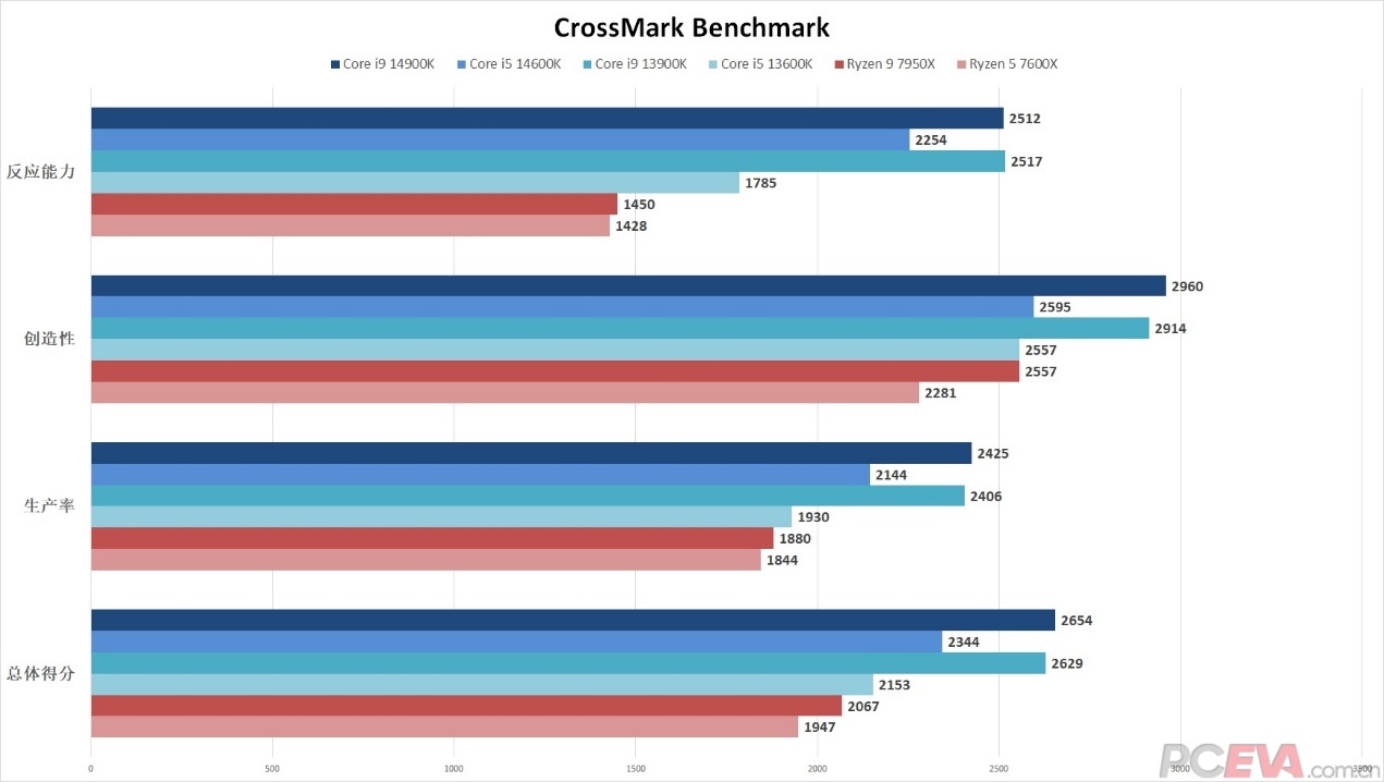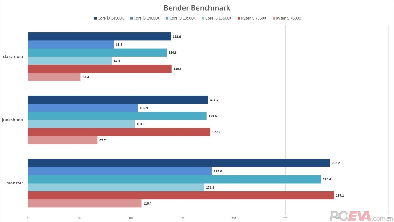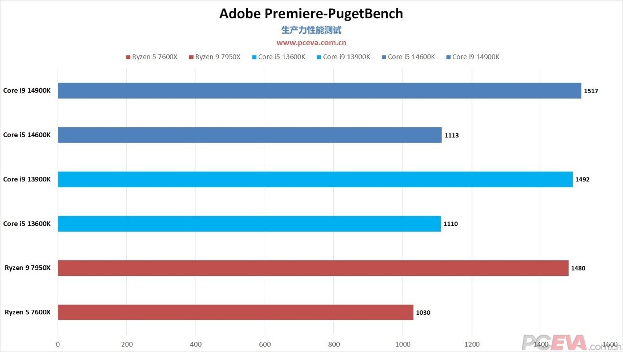 ![]() PhotoShop是比较考验单核性能的测试项目,因为i9-14900K和i5-14600K的最大睿频都提高了200MHz,所以相对上代大约有2%的性能提升。对比锐龙9 7950X和锐龙5 7600X,那酷睿14代的优势就更大了,毕竟从基准测试看,Raptor Lake的单核性能确实是比Zen 4强不少的。在PhotoShop里,i9-14900K和i5-14600K大概比锐龙9 7950X和锐龙5 7600X强13%左右。 ![]() Premiere Pro是更考验多核性能的项目,I9-14900k、i9-13900K和锐龙9 7950X基本在同一性能梯队,性能差距大概3%左右,i5-14600K和i5-13600K是第二梯队,核心数只有6个的锐龙5 7600X是第三梯队,大概和i5差了8%左右。 ![]() Blender是一个动画制作软件,酷睿i9 14900K和酷睿i5 14600K相较上代大概提升了2%-3%,锐龙9 7950X虽然有16个核心,但与酷睿i9 14900K的多核性能研究伯仲之间,差距大约在1%-2%左右。酷睿i5因为有14核,对比锐龙5 7600X自然是秒杀的成绩,比之快了60%左右。 ![]() CrossMark是一个跨平台的基准测试软件,支持Windows、安卓、苹果、Linux、ChromeOS平台,主要调用真实的软件模块来进行模拟测试,并生成唯一链接可实时查看成绩。在这个测试里,锐龙平台基本不占优势,锐龙9 7950X的成绩比酷睿i5还要低一些,酷睿i9 14900K和酷睿i9 13900K则差不多,同样酷睿i5 14600K与i5 13600K也基本是相当的水平,成绩大约能提高个1%-3%。 |