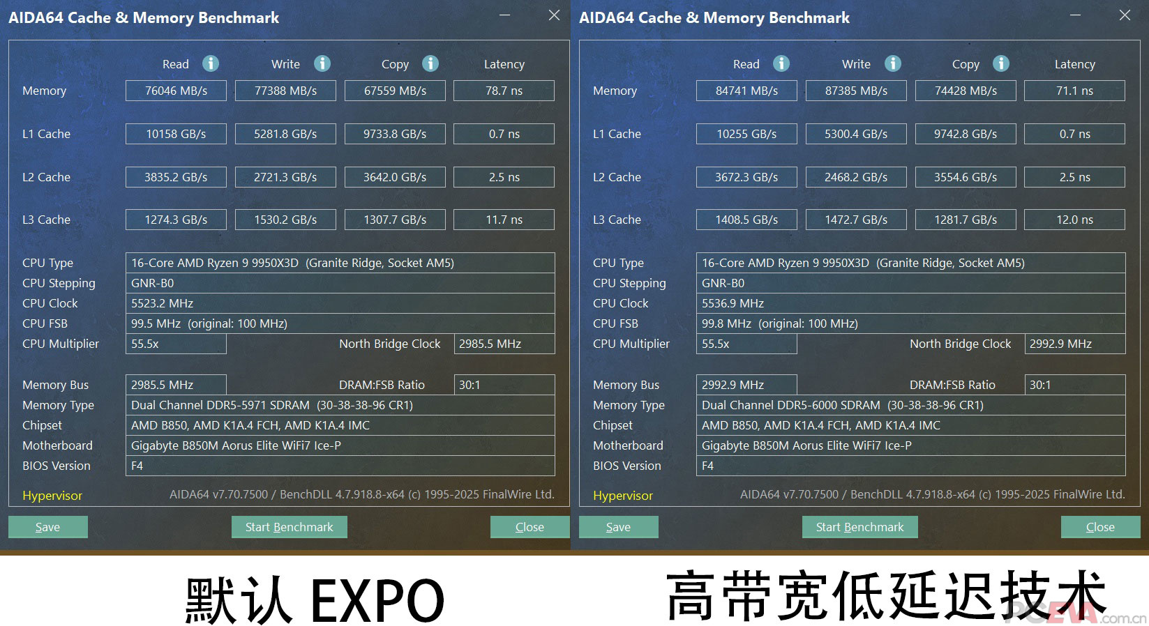 ![]() 在技嘉黑科技里,我最推荐开的是高带宽低延迟技术。它通过对内存时序的优化,给用户带了实实在在的内存性能提升。以我们这次用的DDR5-6000MHz C30内存为例,默认EXPO下,它的读写速度是76GB/s和77GB/s,拷贝速度67GB/s,开启高带宽低延迟技术后,它的读取速度从76GB/s提高到84GB/s,增幅10.5%;写入速度从77GB/s提高到87GB/s,增幅12.9%;拷贝速度从67GB/s提高到74GB/s,增幅10.4%。内存延迟也从78.7纳秒降低至71.1纳秒,降低了9.6%的内存延迟。 ![]() 第二个我推荐你开启的功能是技嘉的PBO Enhancement,这项技术在AMD PBO的基础上预调了电压、电流、功耗等参数,让处理器获得更高的性能提升幅度。它分为90L1-L5/80L1-L5/70L1-L5,三档五个等级,数字小越激进,我个人推荐你选80L4、90L3更稳。 ![]() 可以看到,锐龙9 9950X3D默认大概能跑到4W1,开了PBO Enhancement 80L4后可以跑到4W4,多核性能大约提高了6.6%。 |