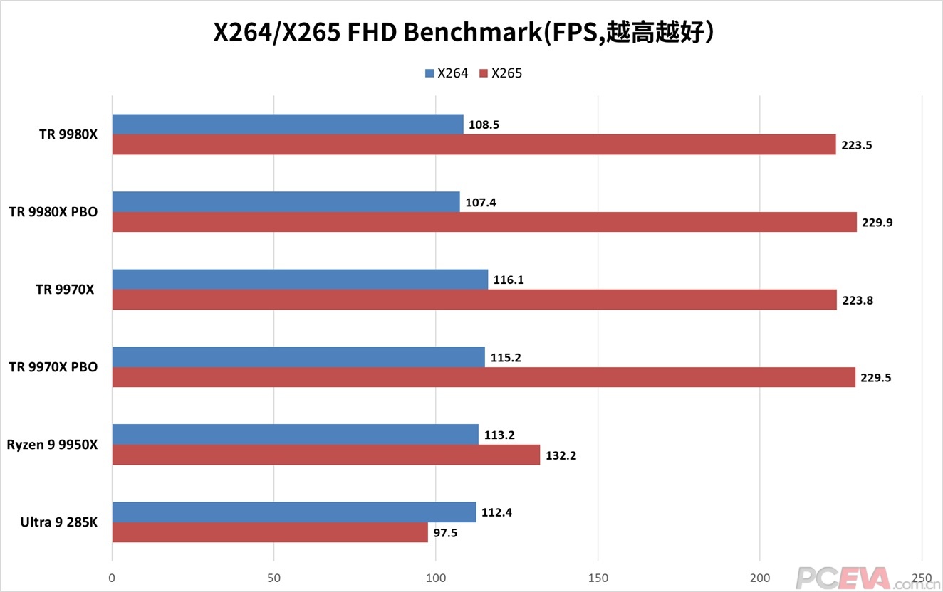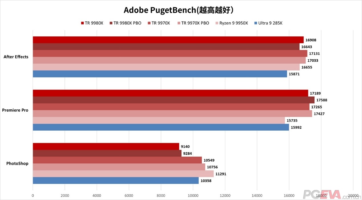 ![]() X264 FHD Benchmark是一款视频转换类测试工具,通过CPU硬解来转码6个高码率视频,测试CPU的转码性能。 ![]() 看得出来,X264对于多线程支持度较差,更吃核心频率。四款处理器在X264 -Benchmark里的成绩基本相当,只有TR 9980X在相同负载下,频率略低一些,所以成绩低了大约6%左右。X265 FHD Benchmark对多线程支持度就高了不少,TR 9000的成绩大约是R9 9950X的1.7倍,大约是U9 285K的2.3倍。不过TR 9980X和TR 9970X的成绩基本一样,说明X265最多也就支持64线程。 ![]() Adobe三件套的成绩也是类似,TR 9980X并没能发挥出64核128线程的规模优势,成绩与TR 9970X基本相当或略低一些,Adobe三件套的核心利用率只能到32核64线程。TR 9970X在AE里获得第一,比R9 9950X略高3%,比U9 285K高7%;在PR里与TR 9980X基本相当,但优于9950X和285K大约10%;在PS里则比R9 9950X低6.5%,比285K高1.8%。 |