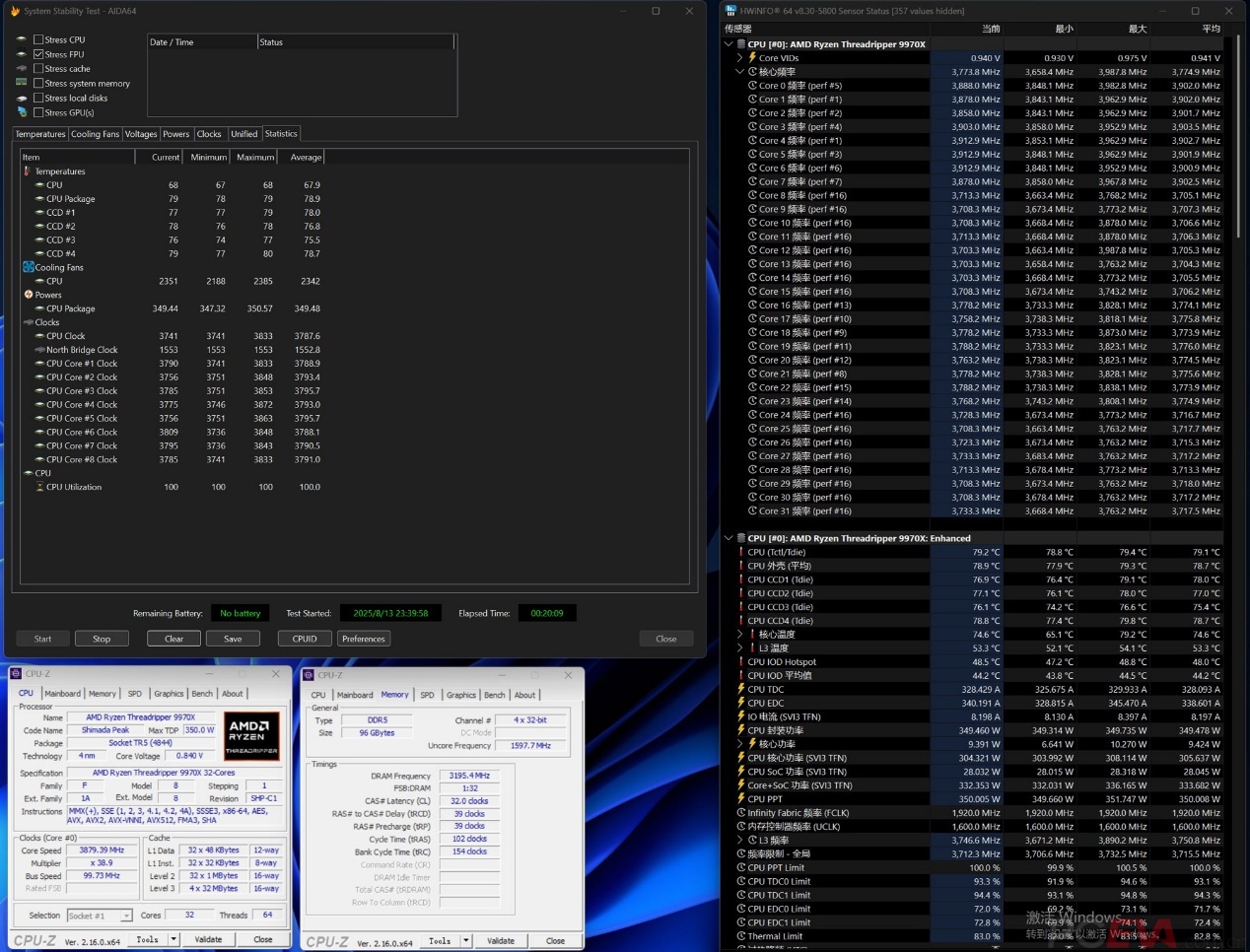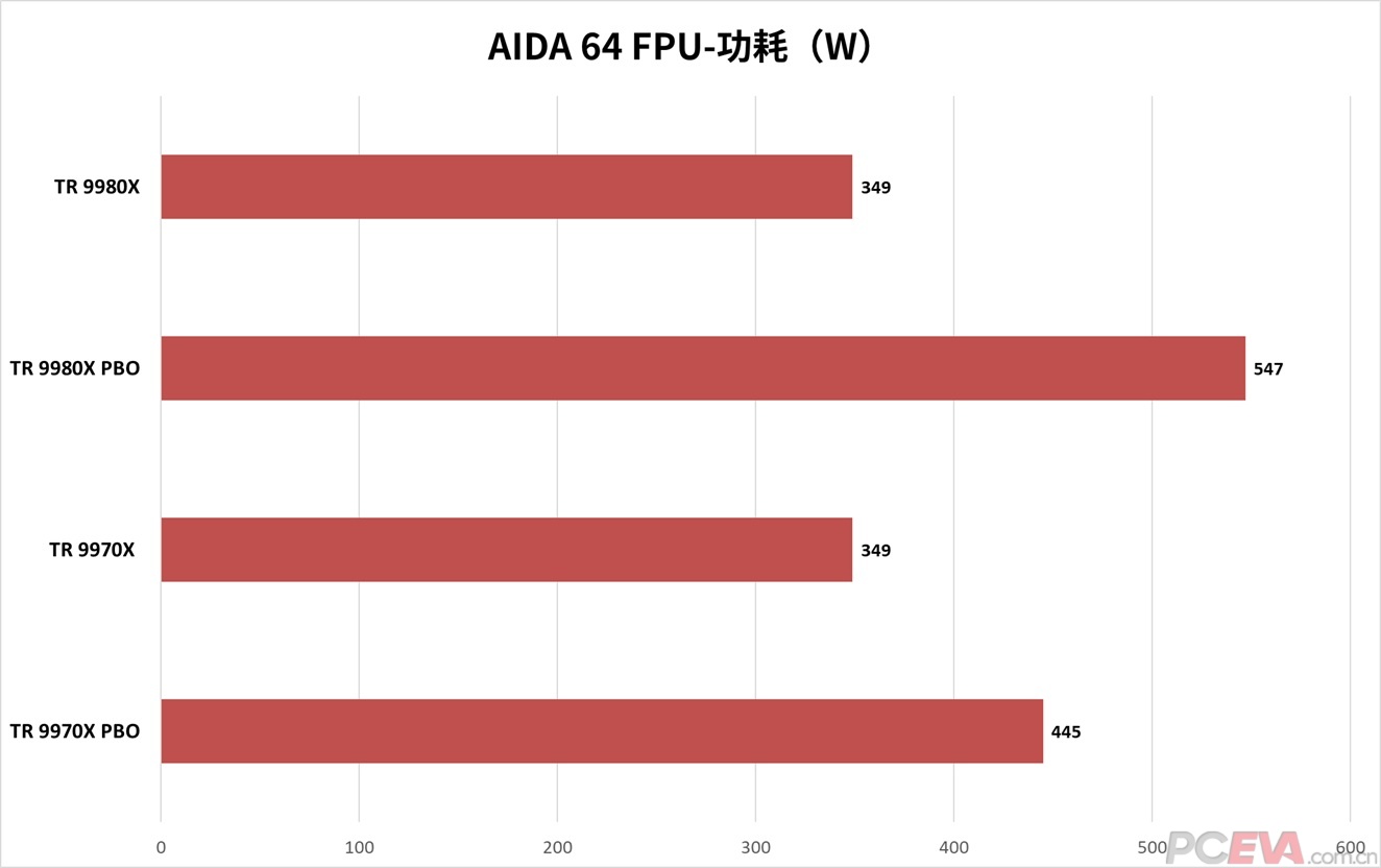 ![]() 功耗测试我们用AIDA64 FPU来进行,测试方法是烧机15分钟,并清除均值数据,收录第15-20分钟的数据,计算均值功耗。 ![]() 默认状态时,TR 9980X和TR9970X的最大功耗都是350W。开了PBO后,TR 9980X的平均功耗大约在547W,TR 9970X的平均功耗大约在445W,相对默认功耗分别提高了56%和27%。 |