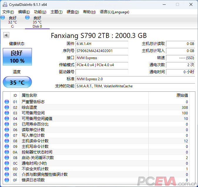 本次评测的梵想S790 2TB搭载了6.W.1.4H版本固件,使用PCIe 4.0 x4接口,支持NVMe 2.0协议。